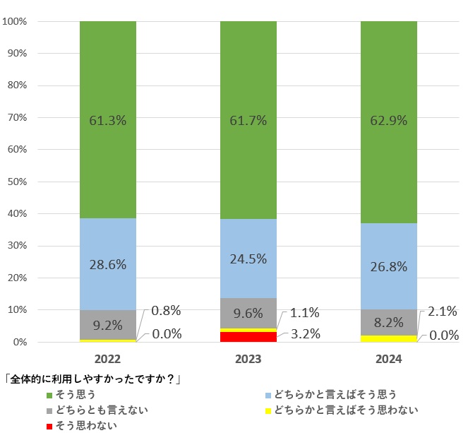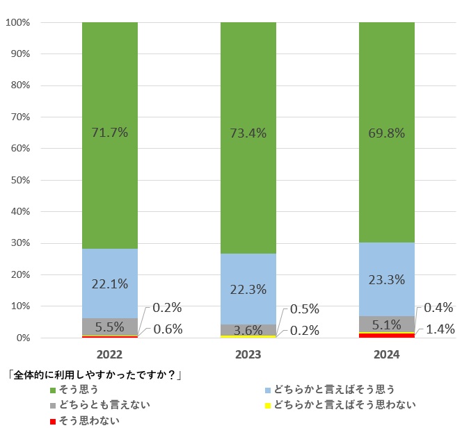 外来診療における受付、待ち時間、診察内容、会計やスタッフの対応など全体的に利用しやすかったか、5段階回答の割合を出しています。