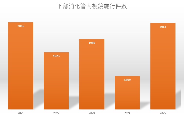 大腸の中に、ポリープや癌がないか、ファイバースコープで観察、評価を行う検査です。年間2000件以上の検査を行っています。検査中にポリープを発見した場合、必要が有れば、その場で切除等の処置を行う事もできます。