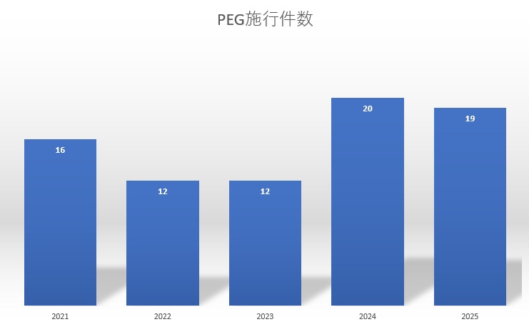 必要な栄養を口から摂取できない患者様に対し、内視鏡を使用して、腹壁外と胃内腔に瘻孔(穴)を形成する手技です。胃の中に直接栄養剤を注入する経路を作る事で、腸から栄養を吸収する事ができ、点滴栄養に比べてより生理的な栄養経路を確保する事ができます。